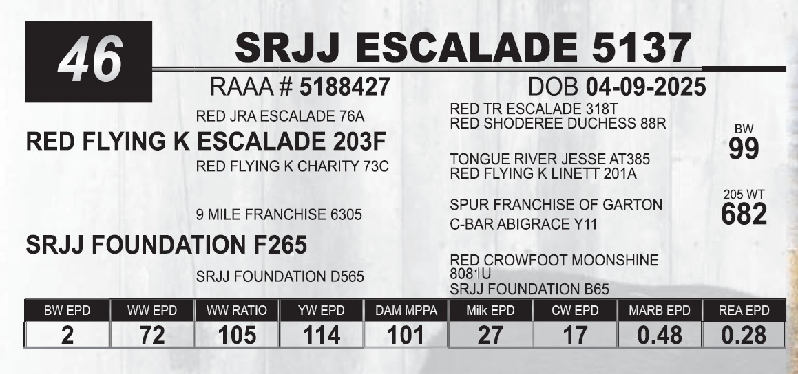 | SRJJ ESCALADE 5137 | 46 | Red Angus Yearling Bull | |
