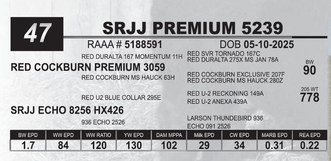 | SRJJ PREMIUM 5239 | 47 | Red Angus Yearling Bull | |