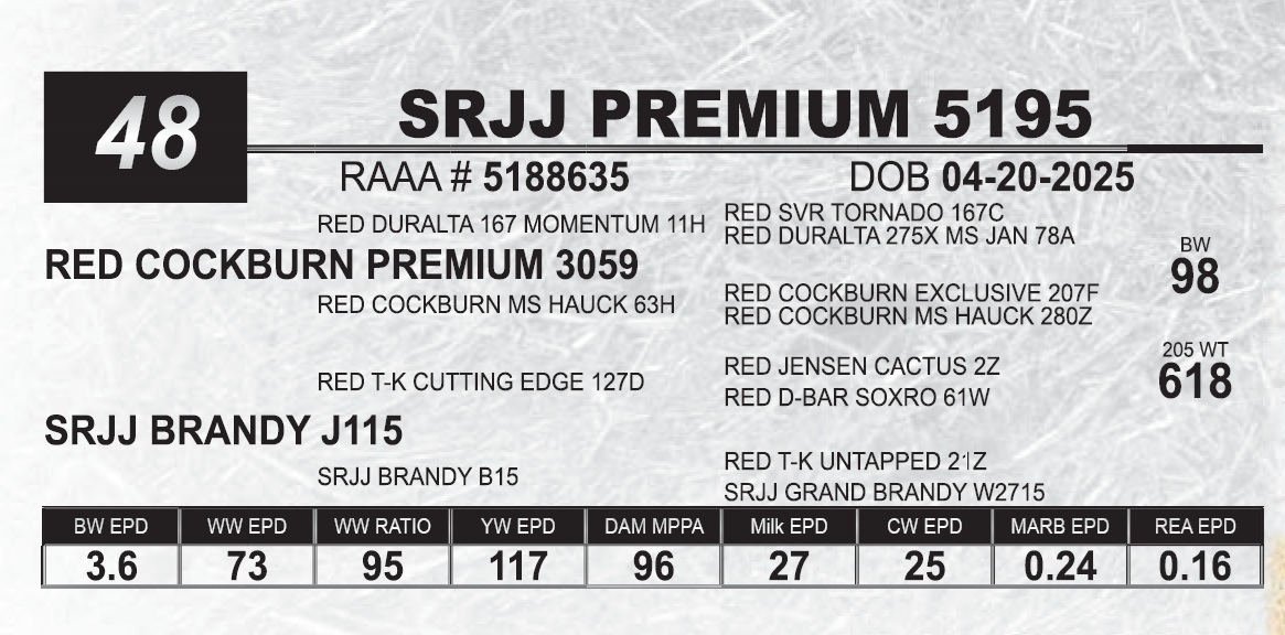 | SRJJ PREMIUM 5195 | 48 | Red Angus Yearling Bull | |