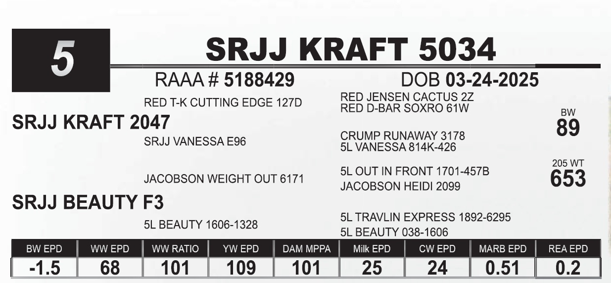 | SRJJ KRAFT 5034 | 5 | Red Angus Yearling Bull | 5034’s dam has done a great job and just keeps cranking out high performance bulls. We have been debating on using one of her sons and this might be the one. |