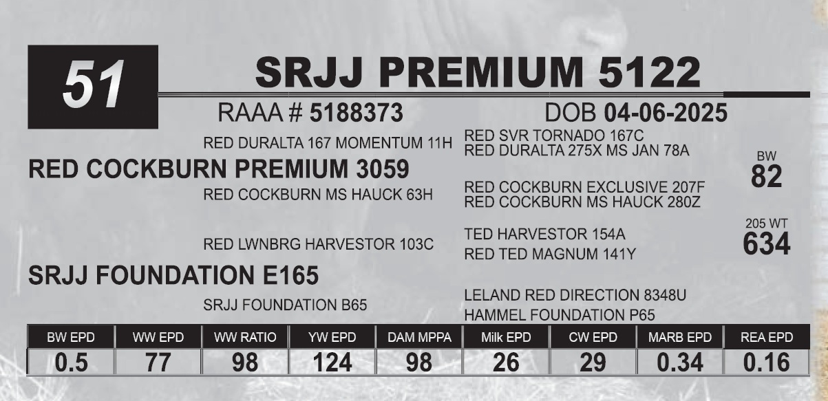 | SRJJ PREMIUM 5122 | 51 | Red Angus Yearling Bull | |