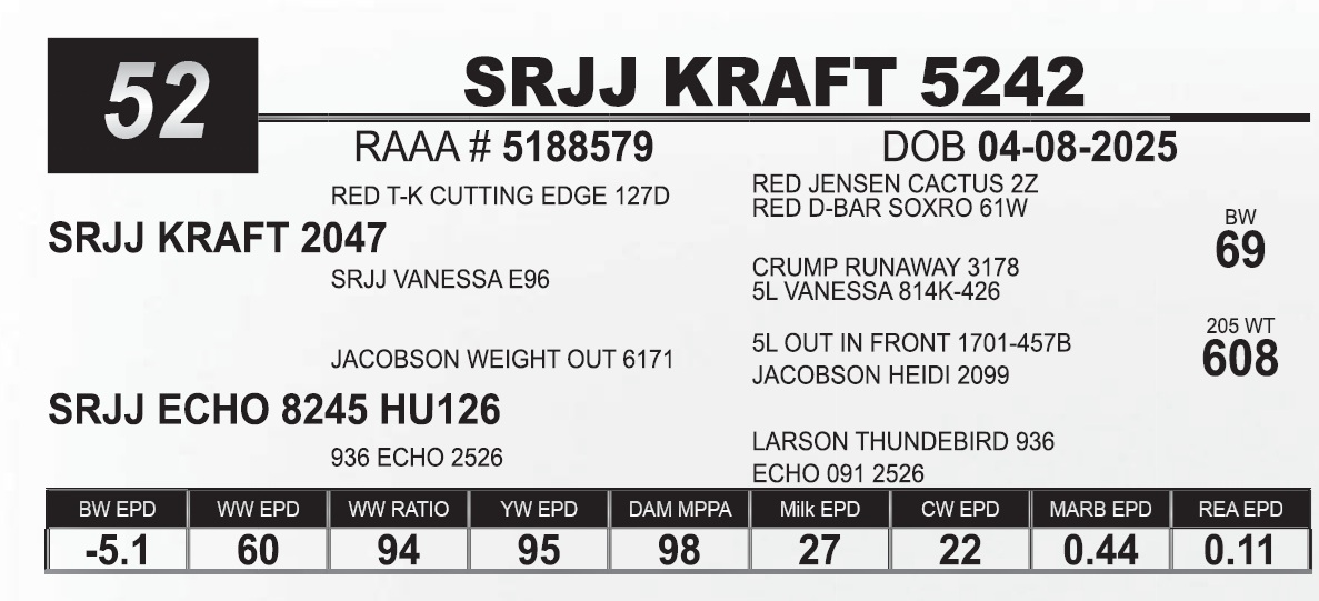 | SRJJ KRAFT 5242 | 52 | Red Angus Yearling Bull | HEIFER BULL |