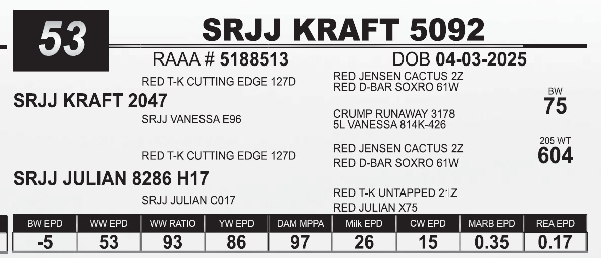 | SRJJ KRAFT 5092 | 53 | Red Angus Yearling Bull | HEIFER BULL |