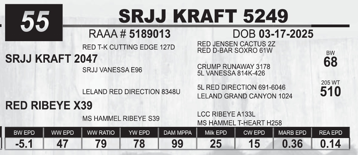 | SRJJ KRAFT 5249 | 55 | Red Angus Yearling Bull | HEIFER BULL |