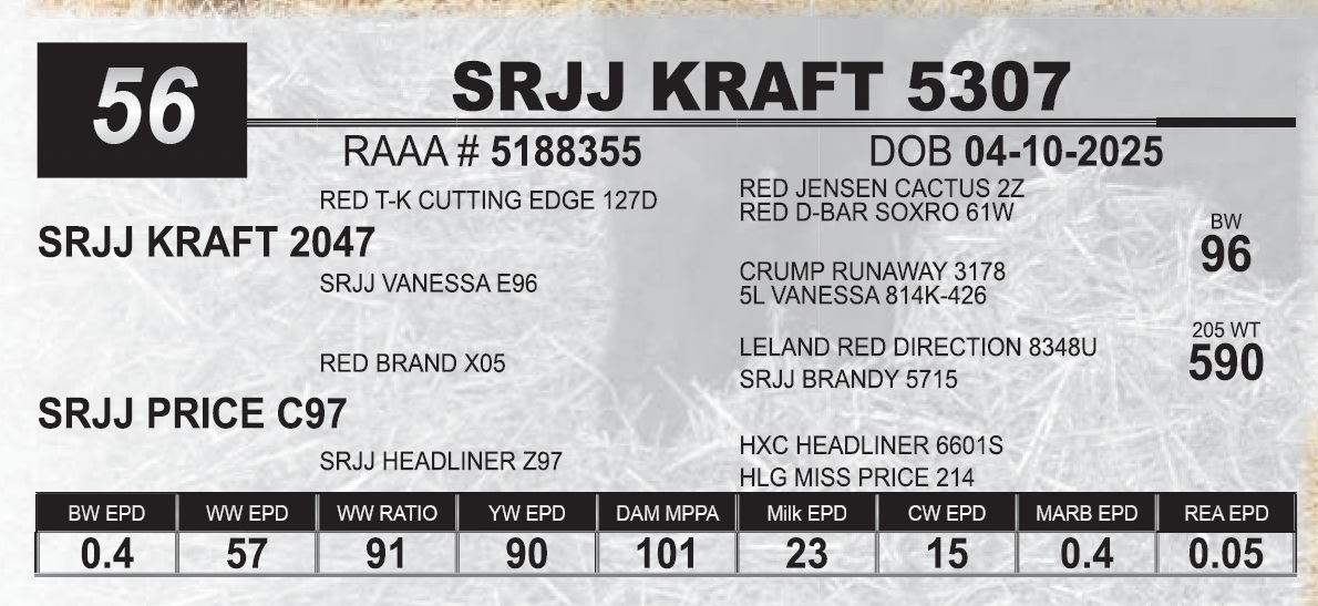 | SRJJ KRAFT 5307 | 56 | Red Angus Yearling Bull | |