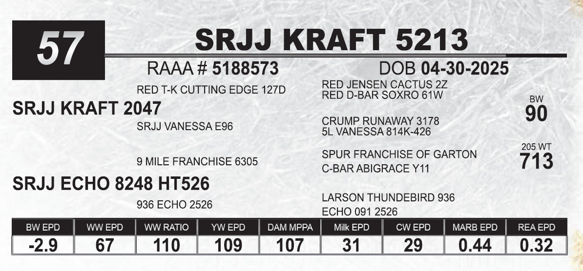| SRJJ KRAFT 5213 | 57 | Red Angus Yearling Bull | |