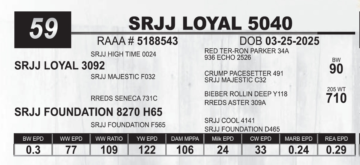 | SRJJ LOYAL 5040 | 59 | Red Angus Yearling Bull | |