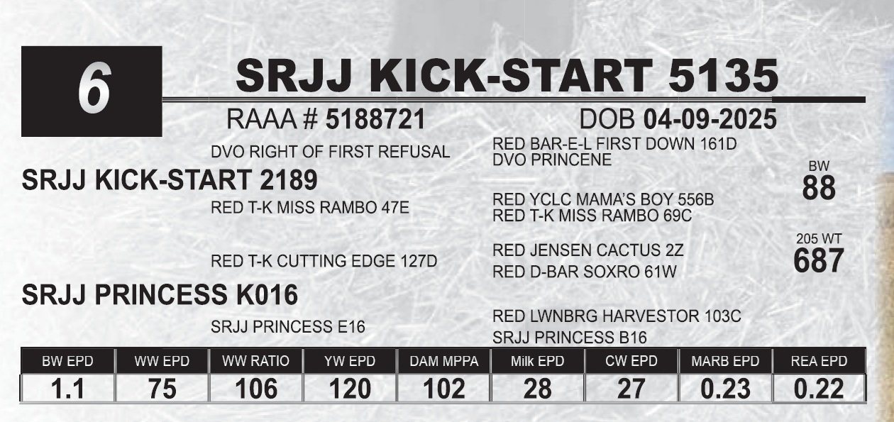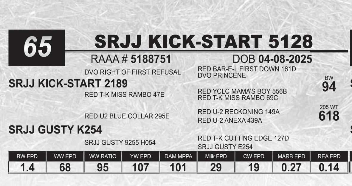 | SRJJ KICK-START 5128 | 65 | Red Angus Yearling Bull | |