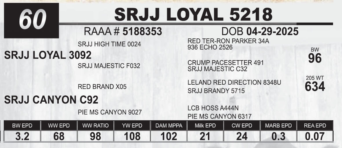 | SRJJ LOYAL 5218 | 60 | Red Angus Yearling Bull | |