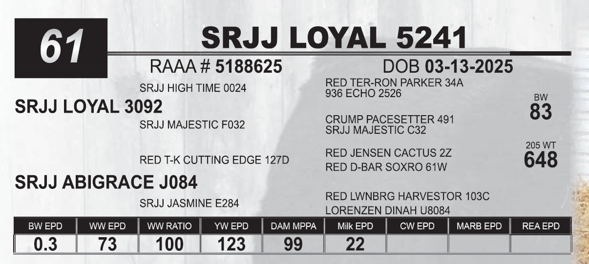 | SRJJ LOYAL 5241 | 61 | Red Angus Yearling Bull | |