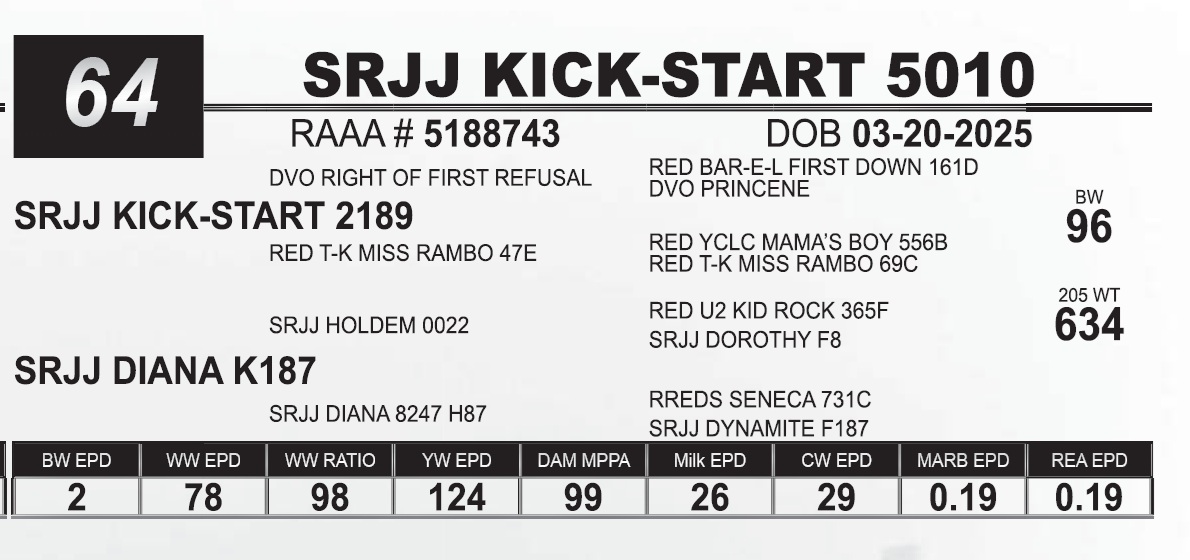 | SRJJ KICK-START 5010 | 64 | Red Angus Yearling Bull | |
