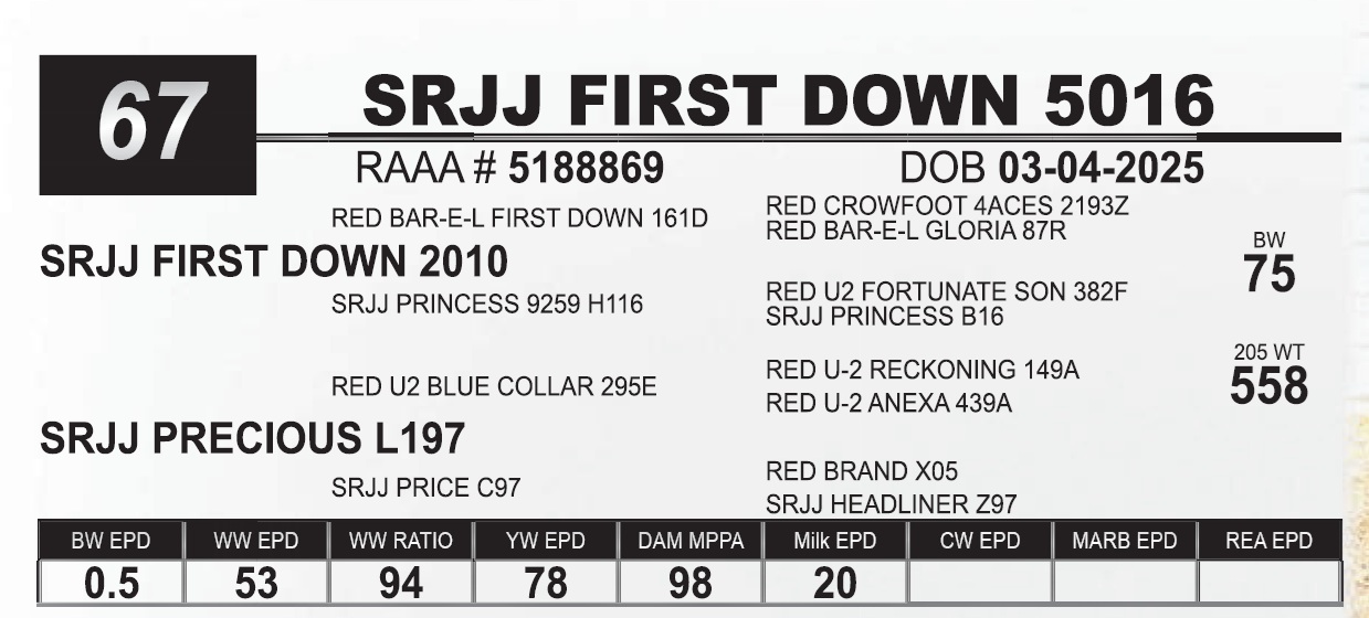 | SRJJ FIRST DOWN 5016 | 67 | Red Angus Yearling Bull | HEIFER BULL |