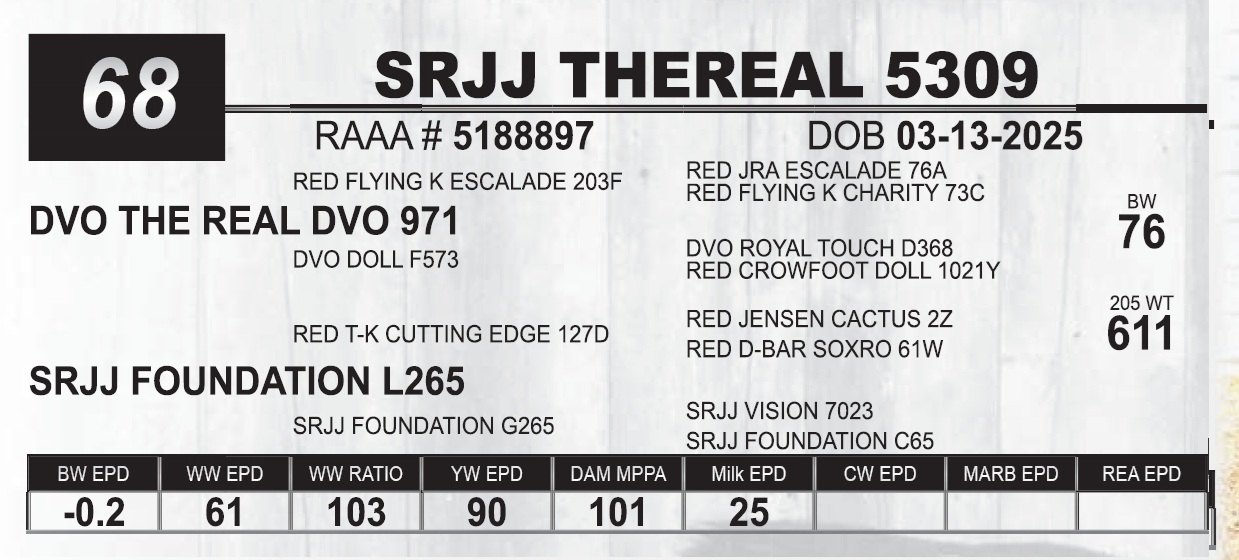 | SRJJ THEREAL 5309 | 68 | Red Angus Yearling Bull | HEIFER BULL |