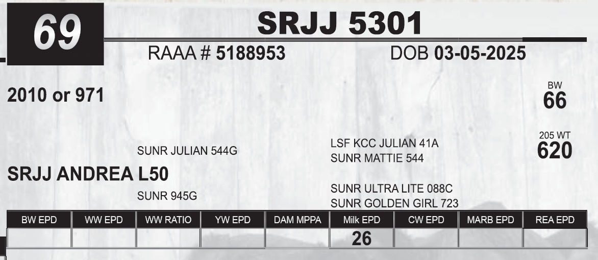 | SRJJ 5301 | 69 | Red Angus Yearling Bull | HEIFER BULL DNA PENDING |