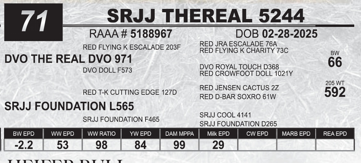 | SRJJ THEREAL 5244 | 71 | Red Angus Yearling Bull | HEIFER BULL |