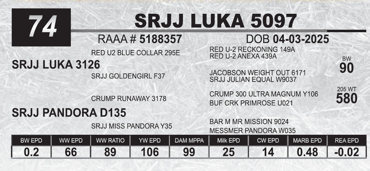 | SRJJ LUKA 5097 | 74 | Red Angus Yearling Bull | |