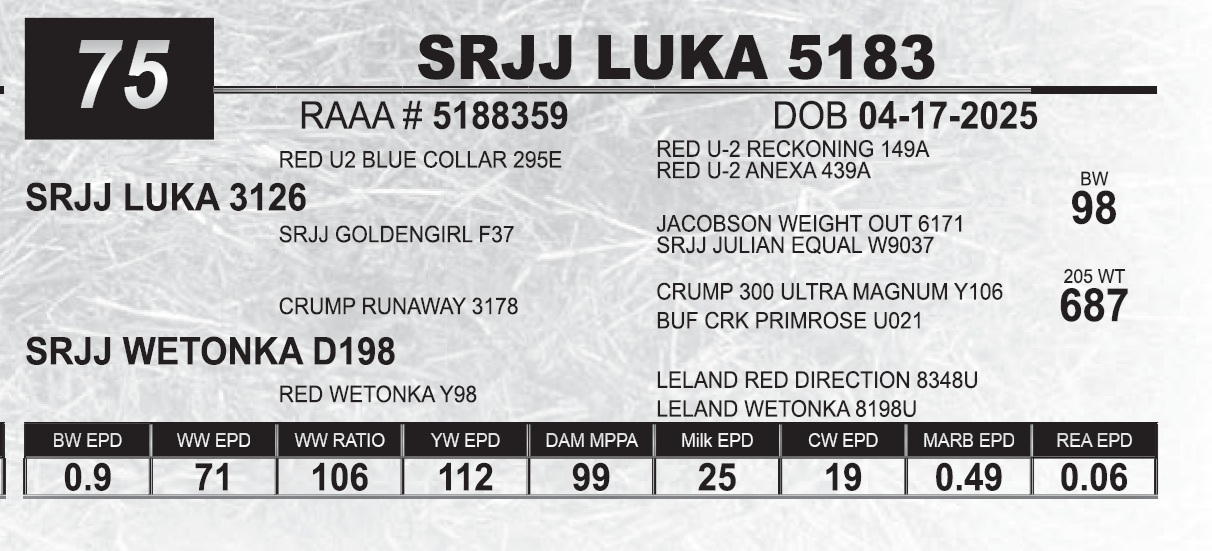 | SRJJ LUKA 5183 | 75 | Red Angus Yearling Bull | |