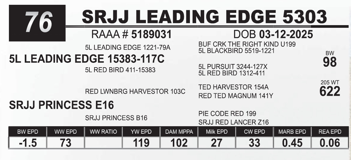 | SRJJ LEADING EDGE 5303 | 76 | Red Angus Yearling Bull | NO VIDEO ON THIS LOT! |