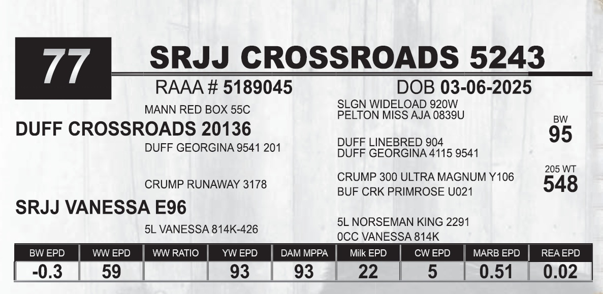 | SRJJ CROSSROADS 5243 | 77 | Red Angus Yearling Bull | |