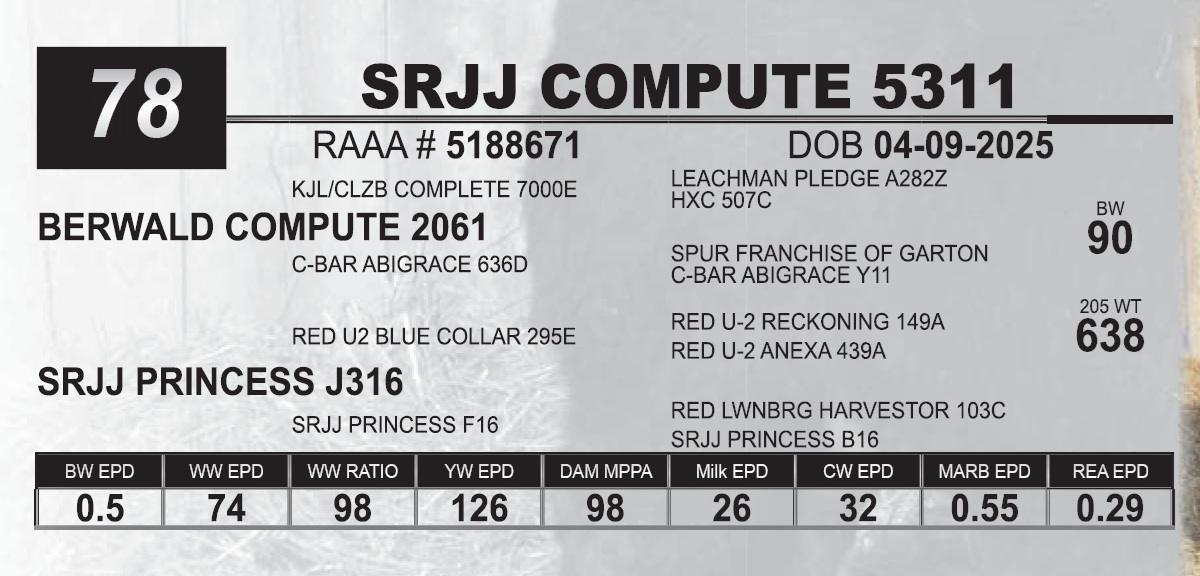 | SRJJ COMPUTE 5311 | 78 | Red Angus Yearling Bull | |