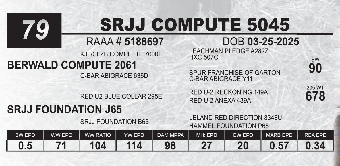 | SRJJ COMPUTE 5045 | 79 | Red Angus Yearling Bull | |
