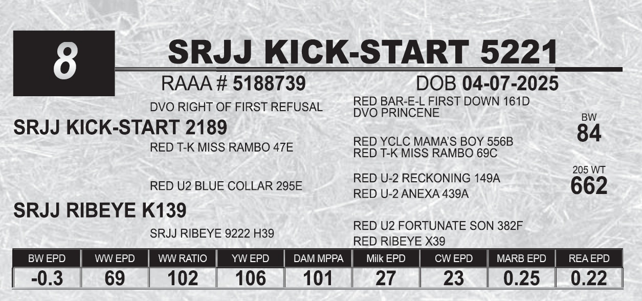 | SRJJ KICK-START 5221 | 8 | Red Angus Yearling Bull | 5221 is full of breed character. A moderate Kick Start son that has had that herd bull look. Lots oflongevity has been bred into this calf. You can expect females that have perfect feet, udders, and stay in the herd. |