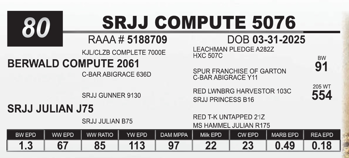 | SRJJ COMPUTE 5076 | 80 | Red Angus Yearling Bull | |