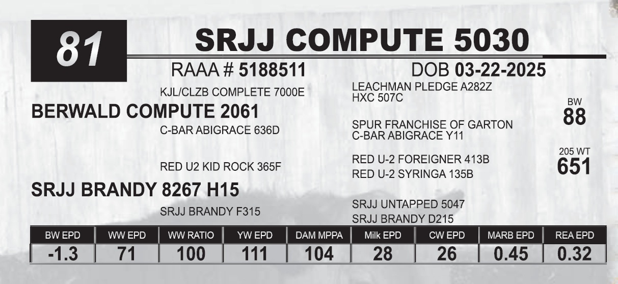 | SRJJ COMPUTE 5030 | 81 | Red Angus Yearling Bull | |