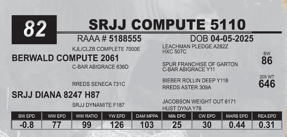 | SRJJ COMPUTE 5110 | 82 | Red Angus Yearling Bull |