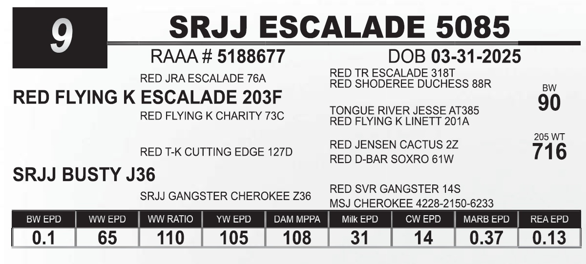 | SRJJ ESCALADE 5085 | 9 | Red Angus Yearling Bull | |