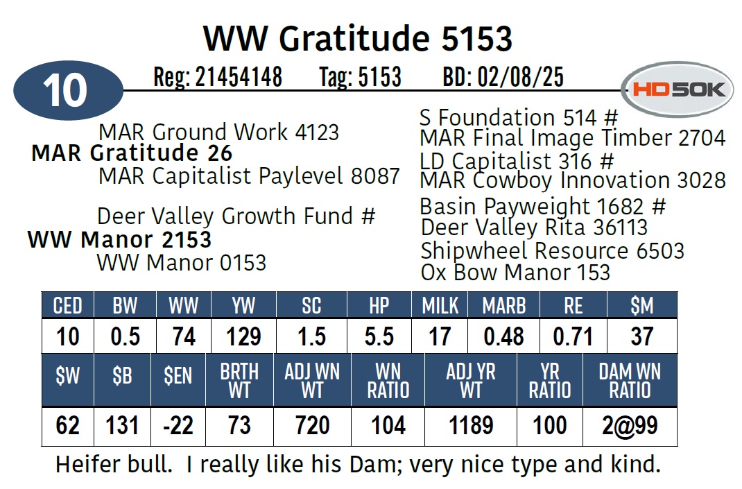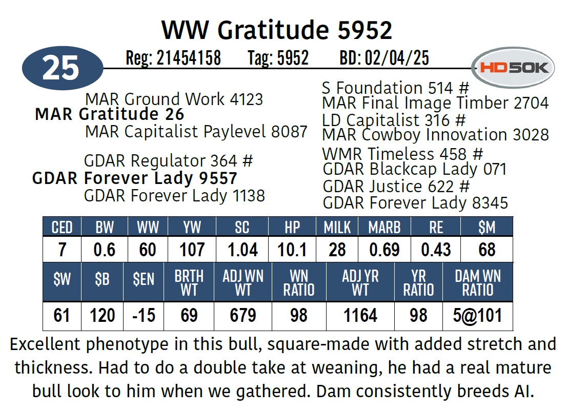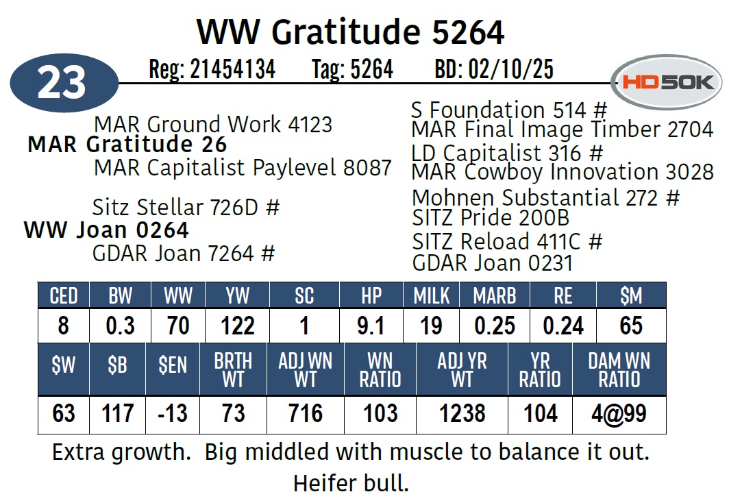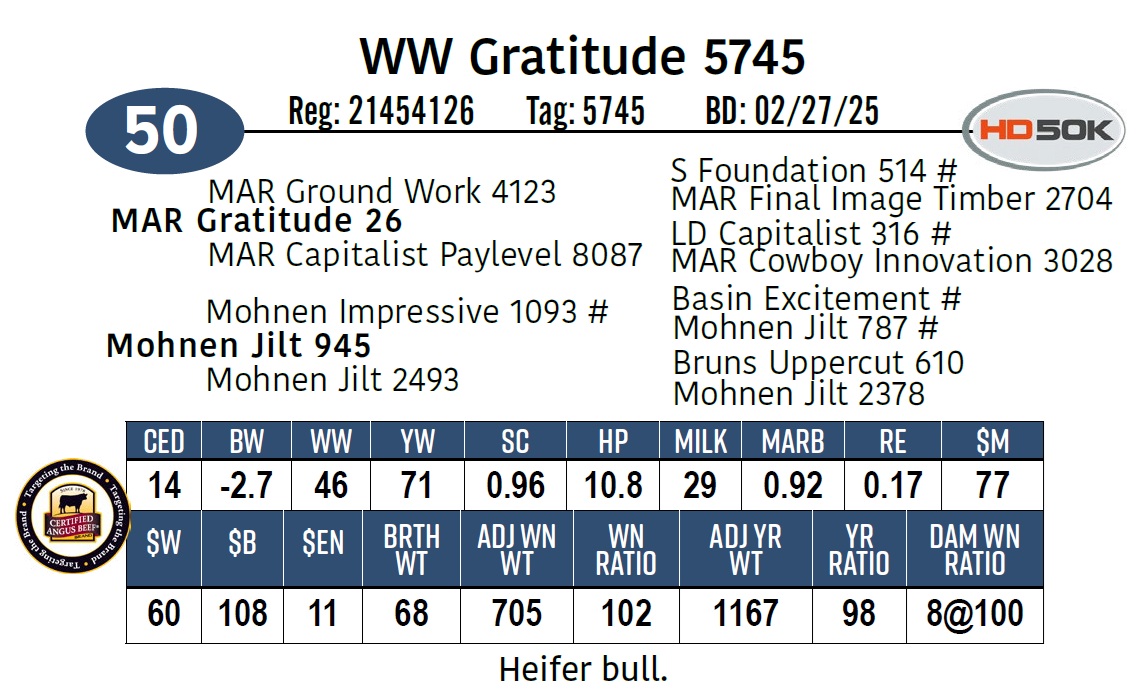 | WW Gratitude 5745 | 50 | Yearling Bull | Heifer bull. |