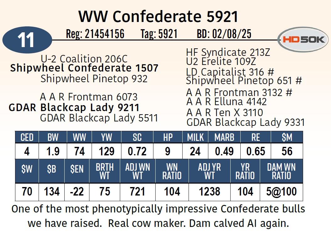 | WW Confederate 5921 | 11 | Yearling Bull | One of the most phenotypically impressive Confederate bulls we have raised. Real cow maker. Dam calved AI again. |