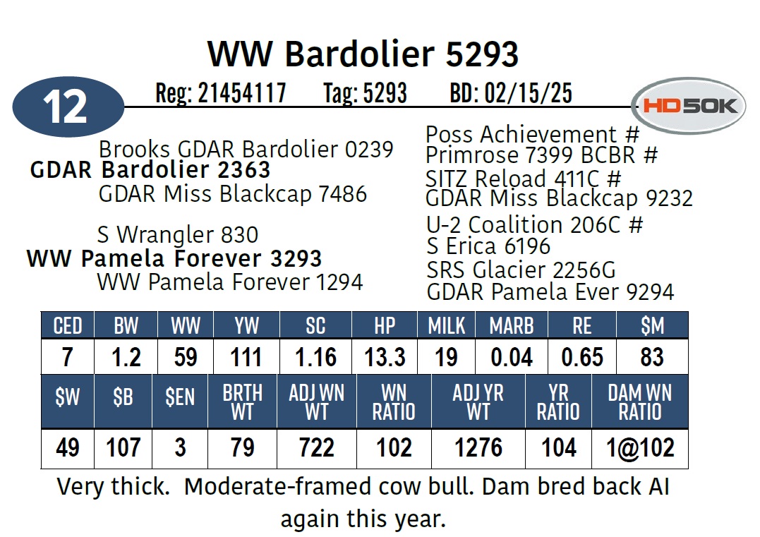 | WW Bardolier 5293 | 12 | Yearling Bull | Very thick. Moderate-framed cow bull. Dam bred back AI again this year. |