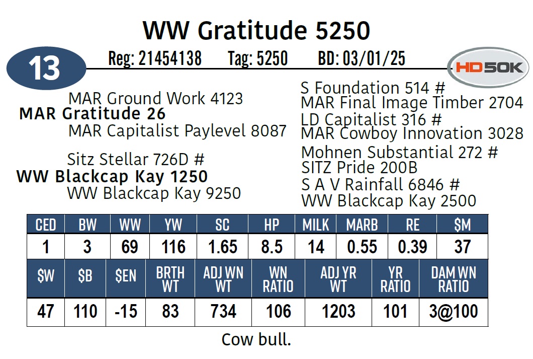 | WW Gratitude 5250 | 13 | Yearling Bull | Cow bull. |