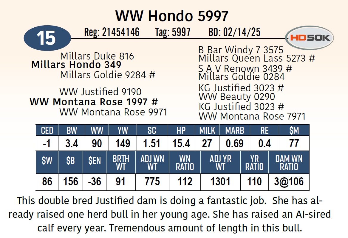 | WW Hondo 5997 | 15 | Yearling Bull | This double bred Justified dam is doing a fantastic job. She has already raised one herd bull in her young age. She has raised an AI-sired calf every year. Tremendous amount of length in this bull. |
