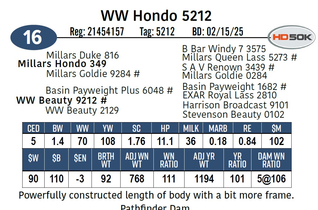 | WW Hondo 5212 | 16 | Yearling Bull | Powerfully constructed length of body with a bit more frame. Pathfinder Dam. |