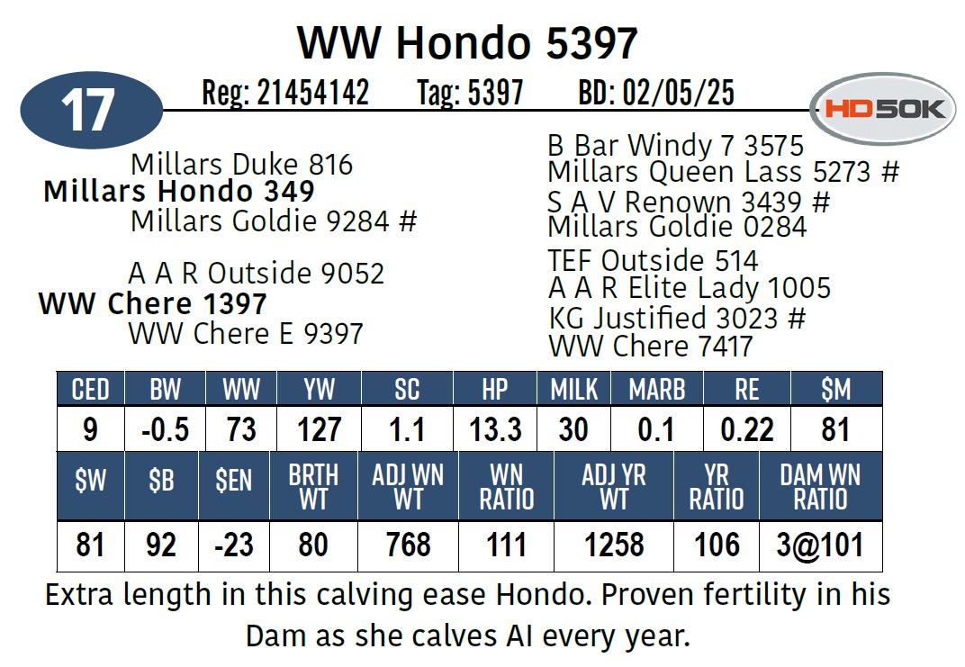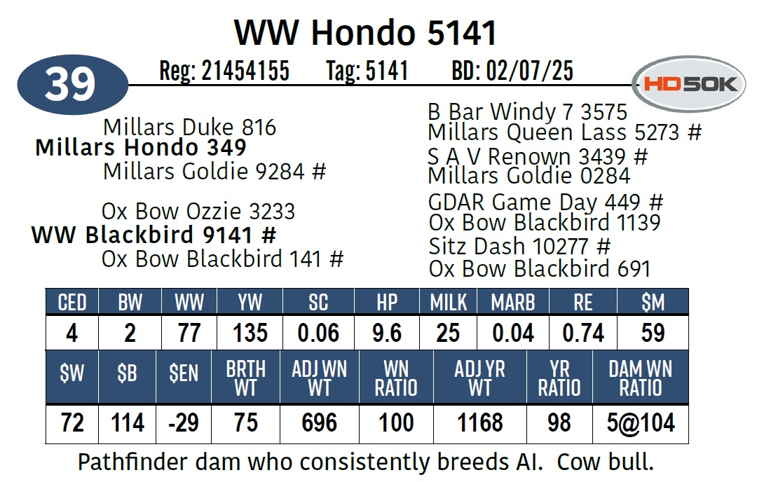 | WW Hondo 5141 | 39 | Yearling Bull | Pathfinder dam who consistently breeds AI. Cow bull |