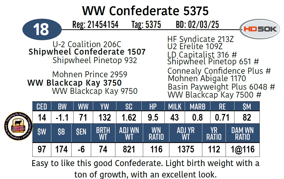 | WW Confederate 5375 | 18 | Yearling Bull | Easy to like this good Confederate. Light birth weight with a ton of growth, with an excellent look. |