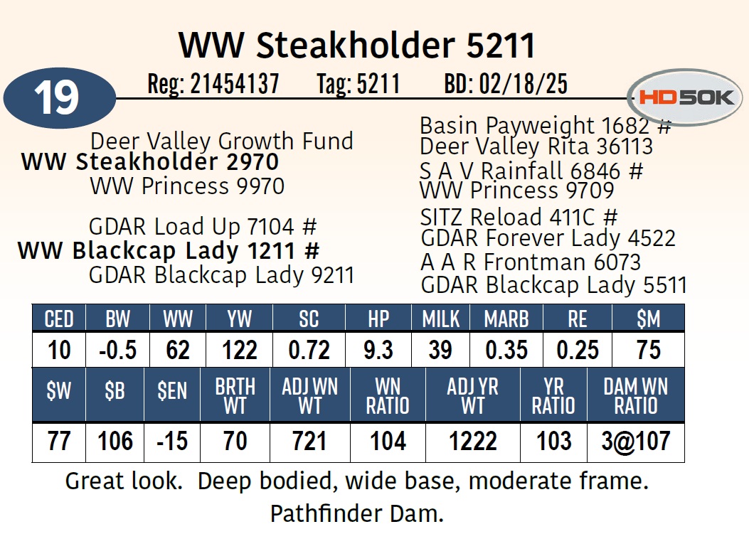 | WW Steakholder 5211 | 19 | Yearling Bull | Great look. Deep bodied, wide base, moderate frame. Pathfinder Dam. |