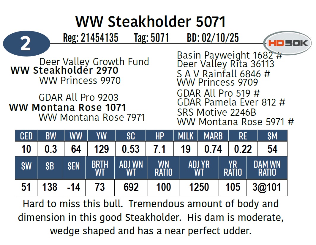 | WW Steakholder 5071 | 2 | Yearling Bull | Hard to miss this bull. Tremendous amount of body and dimension in this good Steakholder. His dam is moderate, wedge shaped and has a near perfect udder. |