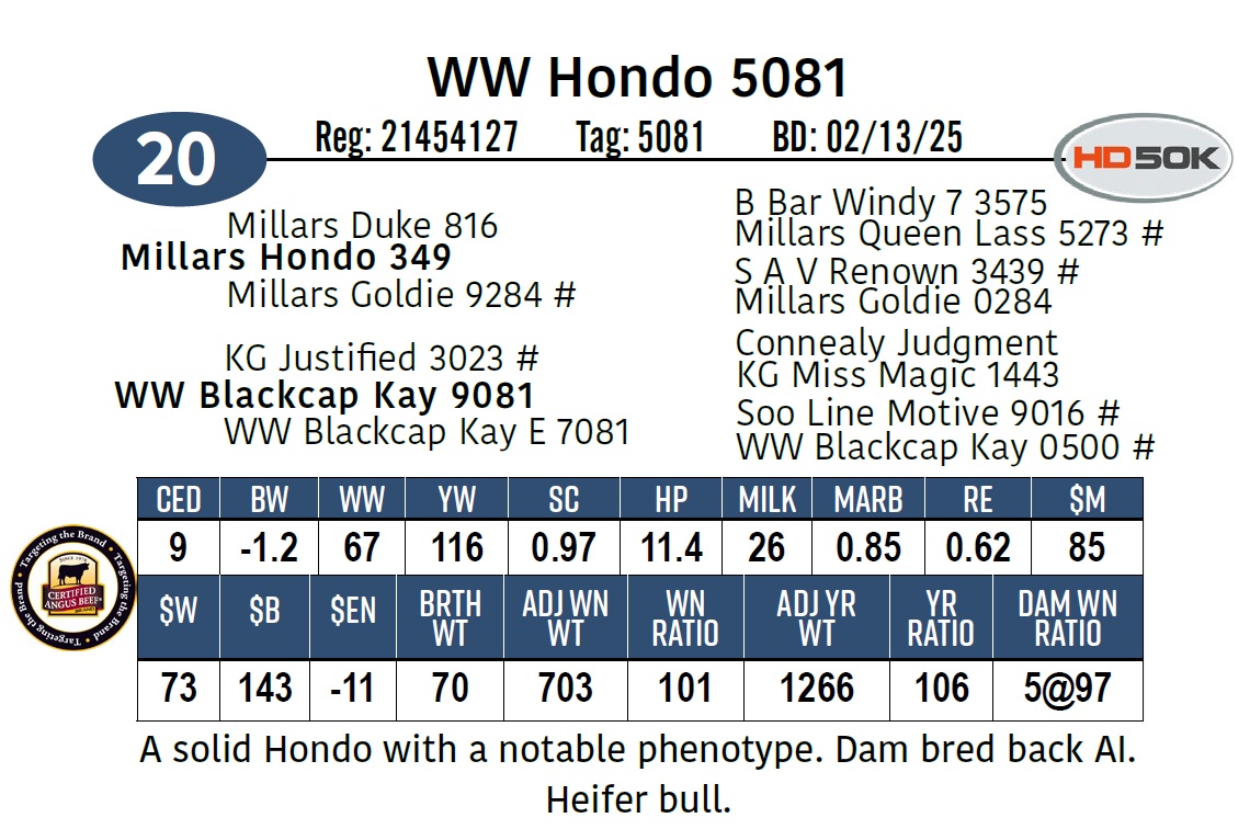 | WW Hondo 5081 | 20 | Yearling Bull | A solid Hondo with a notable phenotype. Dam bred back AI. Heifer bull. |