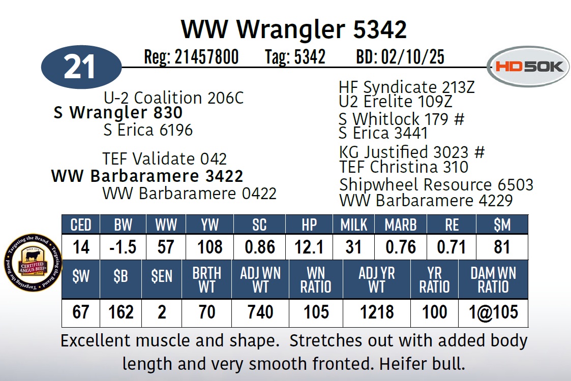 | WW Wrangler 5342 | 21 | Yearling Bull | Excellent muscle and shape. Stretches out with added body length and very smooth fronted. Heifer bull. |