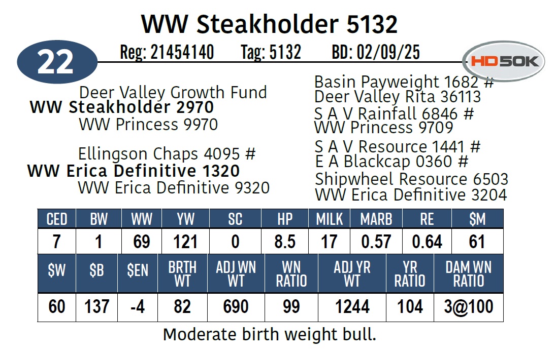 | WW Steakholder 5132 | 22 | Yearling Bull | Moderate birth weight bull. |