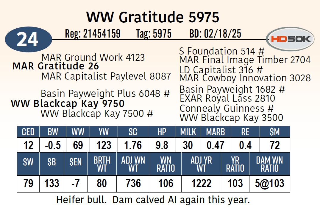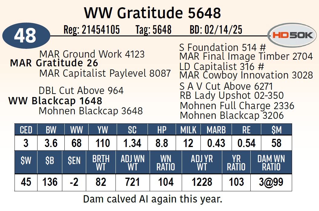 | WW Gratitude 5648 | 48 | Yearling Bull | Dam calved AI again this year |