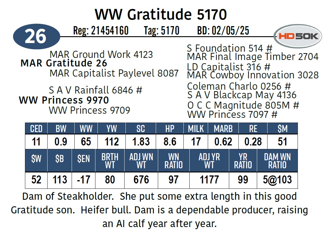 | WW Gratitude 5170 | 26 | Yearling Bull | Dam of Steakholder. She put some extra length in this good Gratitude son. Heifer bull. Dam is a dependable producer, raising an AI calf year after year. |