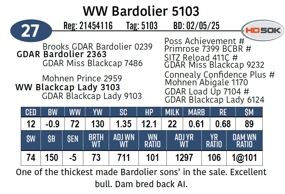 | WW Bardolier 5103 | 27 | Yearling Bull | One of the thickest made Bardolier sons’ in the sale. Excellent bull. Dam bred back AI. |