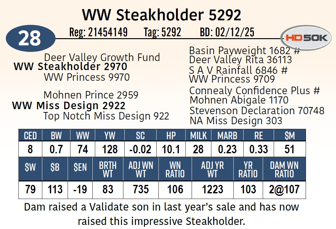 | WW Steakholder 5292 | 28 | Yearling Bull | Dam raised a Validate son in last year’s sale and has now raised this impressive Steakholder |