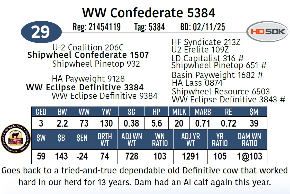 | WW Confederate 5384 | 29 | Yearling Bull | Goes back to a tried-and-true dependable old Definitive cow that worked hard in our herd for 13 years. Dam had an AI calf again this year. |