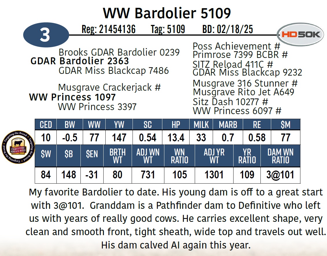 | WW Bardolier 5109 | 3 | Yearling Bull | My favorite Bardolier to date. His young dam is off to a great start with 3@101. Granddam is a Pathfinder dam to Definitive who left us with years of really good cows. He carries excellent shape, very clean and smooth front, tight sheath, wide top and travels out well. His dam calved AI again this year |