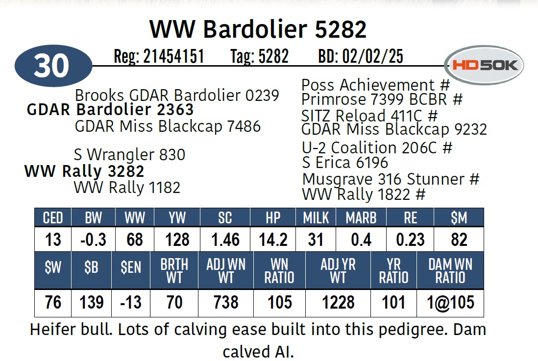 | WW Bardolier 5282 | 30 | Yearling Bull | Heifer bull. Lots of calving ease built into this pedigree. Dam calved AI. |